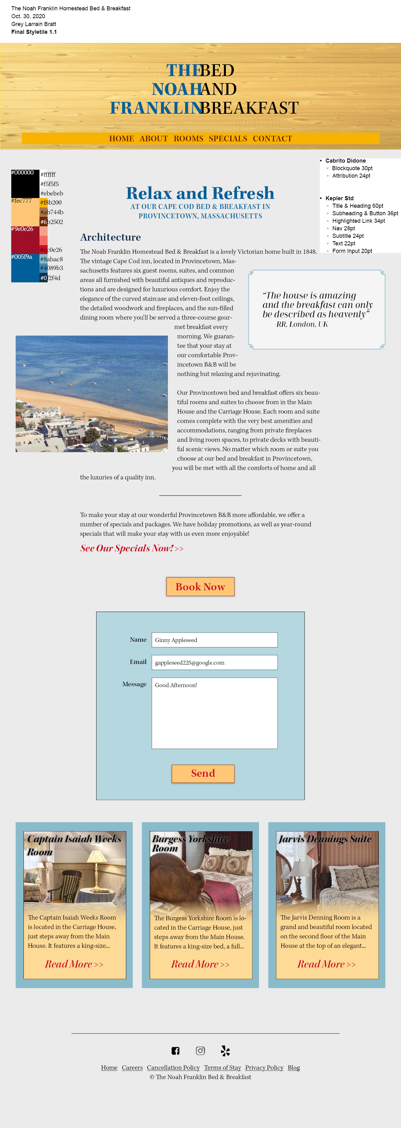 I took my original Colonial New England color scheme and made the colors more inviting, with warmer and more saturated hues. The fonts felt classic and formal like the colonial era, but still kept some charm and quirkiness in their serifs to highlight the uniqueness of the B&B.